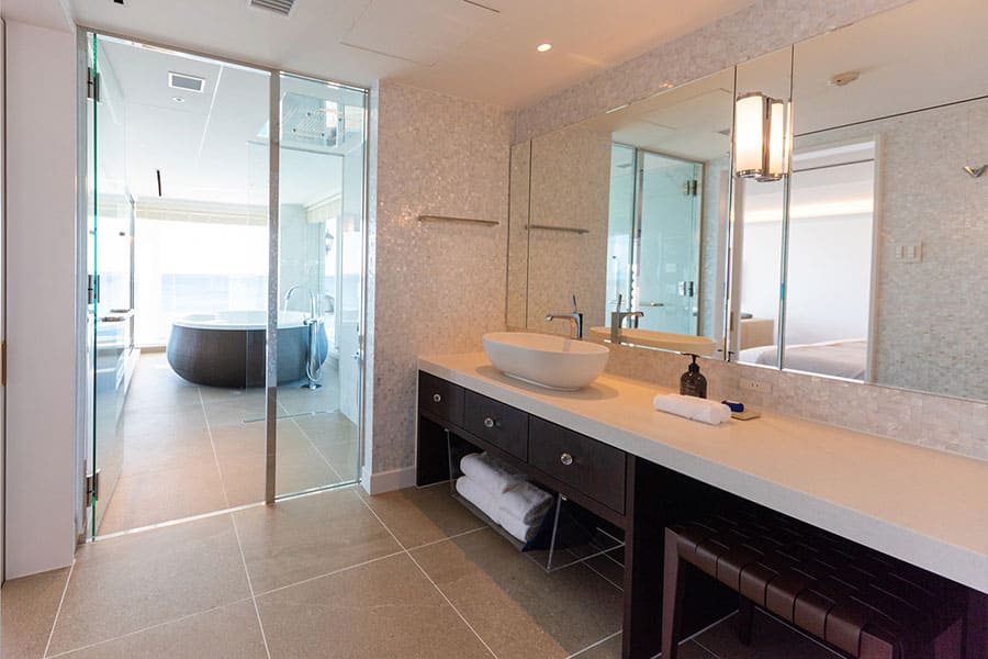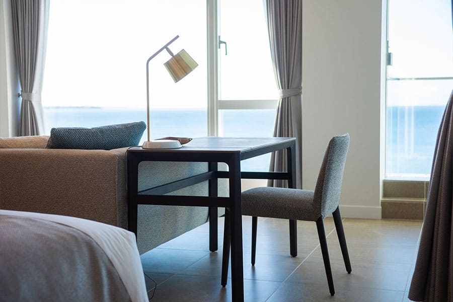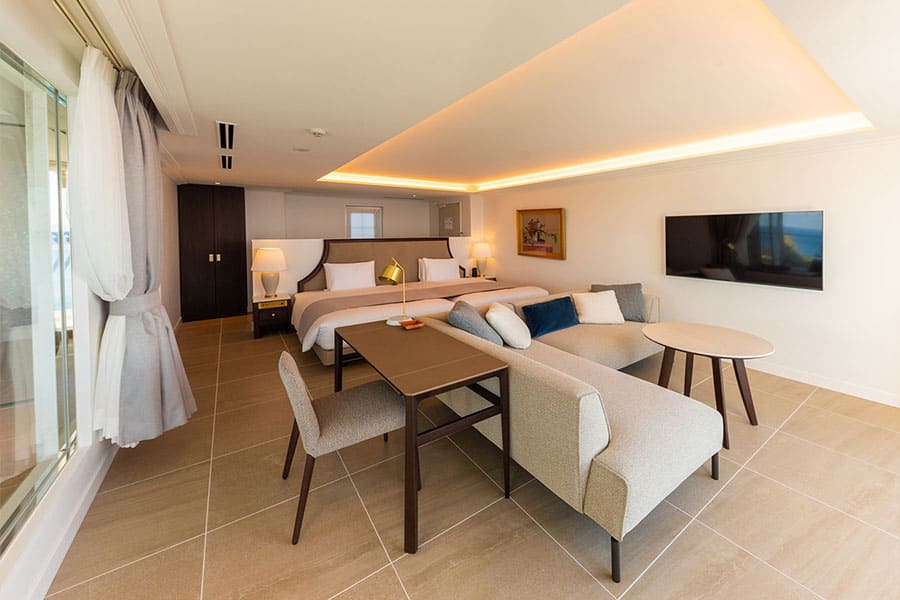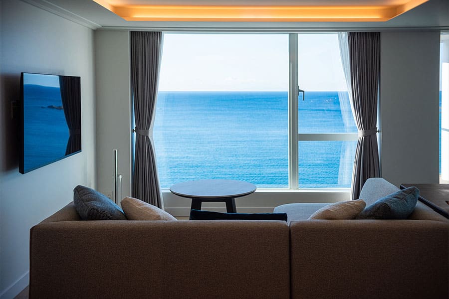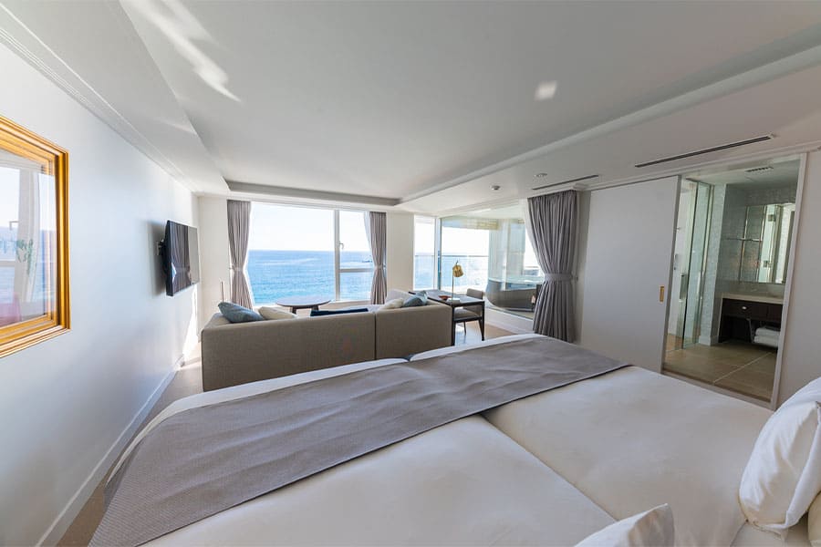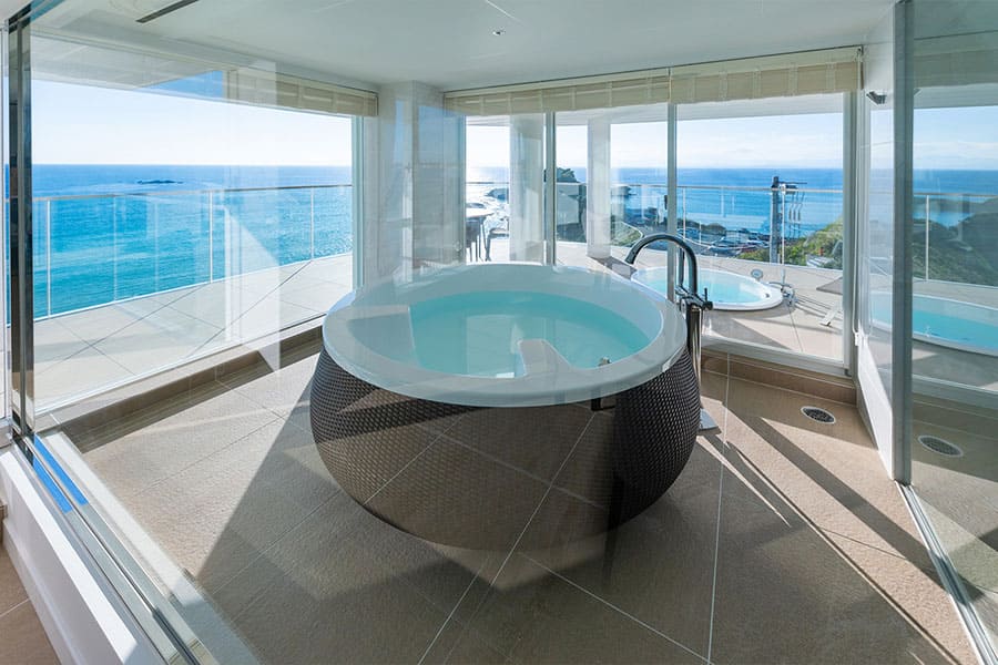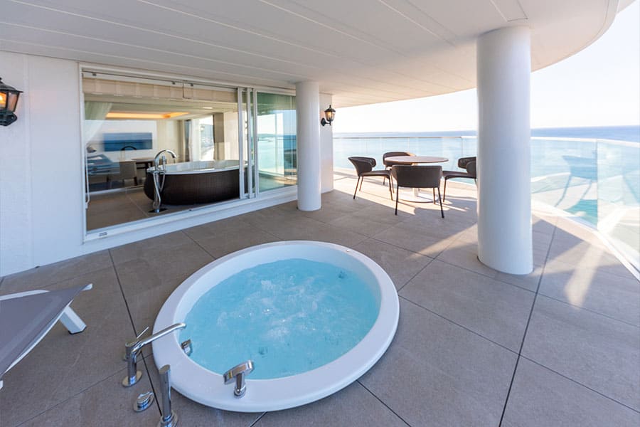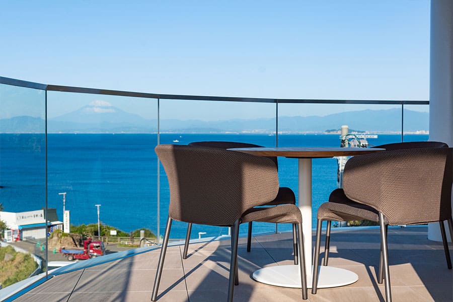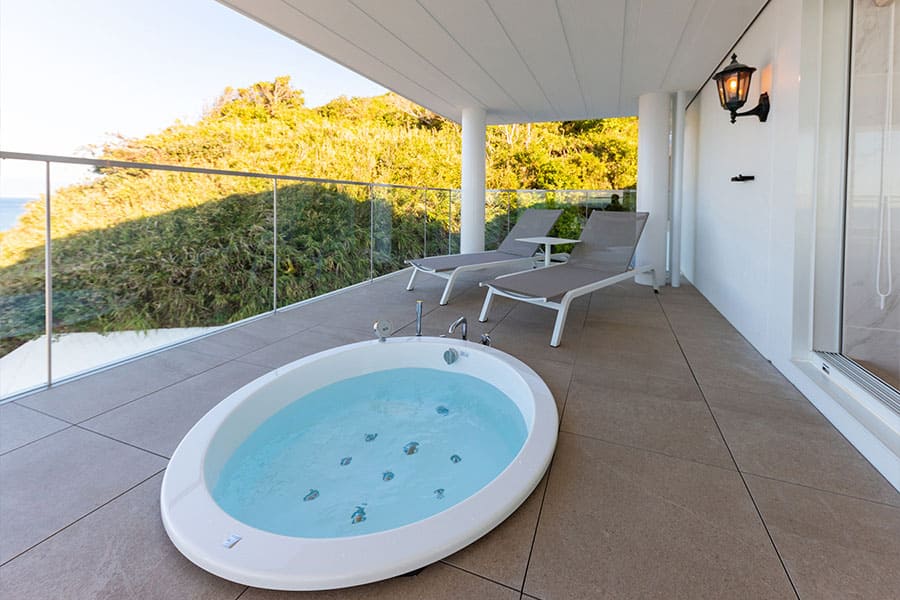 富士山、伊豆半島、箱根連山、三浦半島を一望する、贅沢なロケーションを凝縮した角部屋です。 屋根付きのバルコニーでは天候を気にせずジャグジーを堪能でき、食事用のテーブルセットや寝そべり用のサマーベッドも設置。 2階から広がる180度の大パノラマが、忘れ得ぬ滞在を演出します。