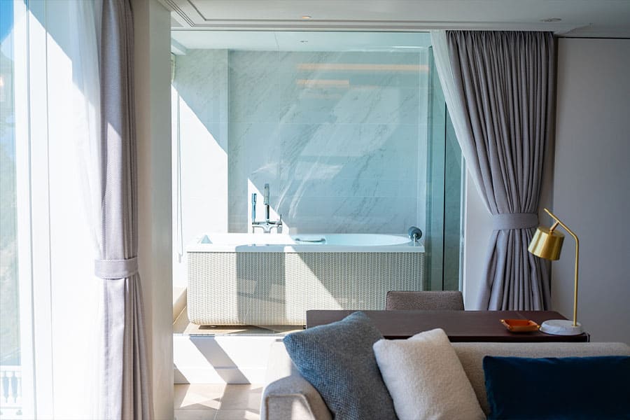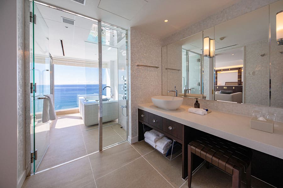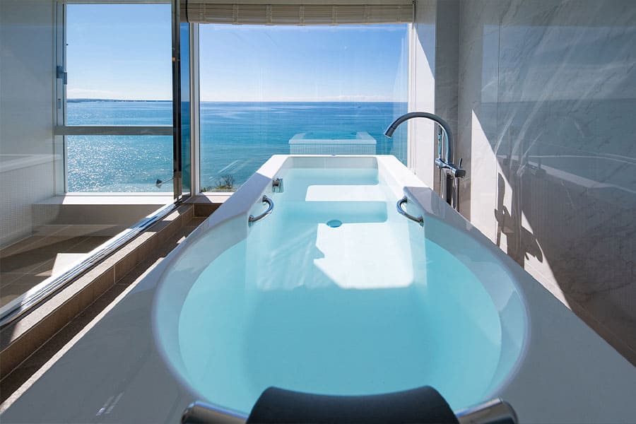 バスルームでは、浴槽に身を沈めながらまるで海に浮かんでいるかのようなひとときを。