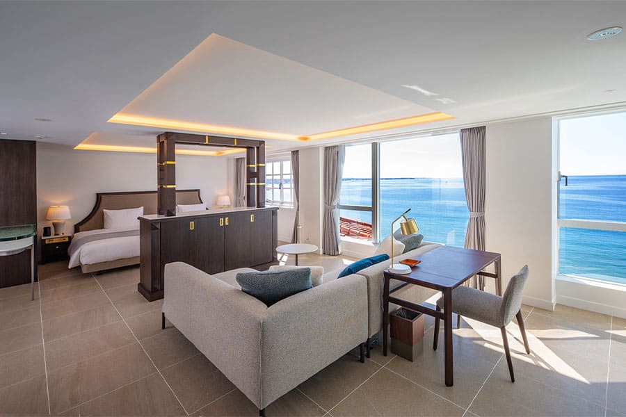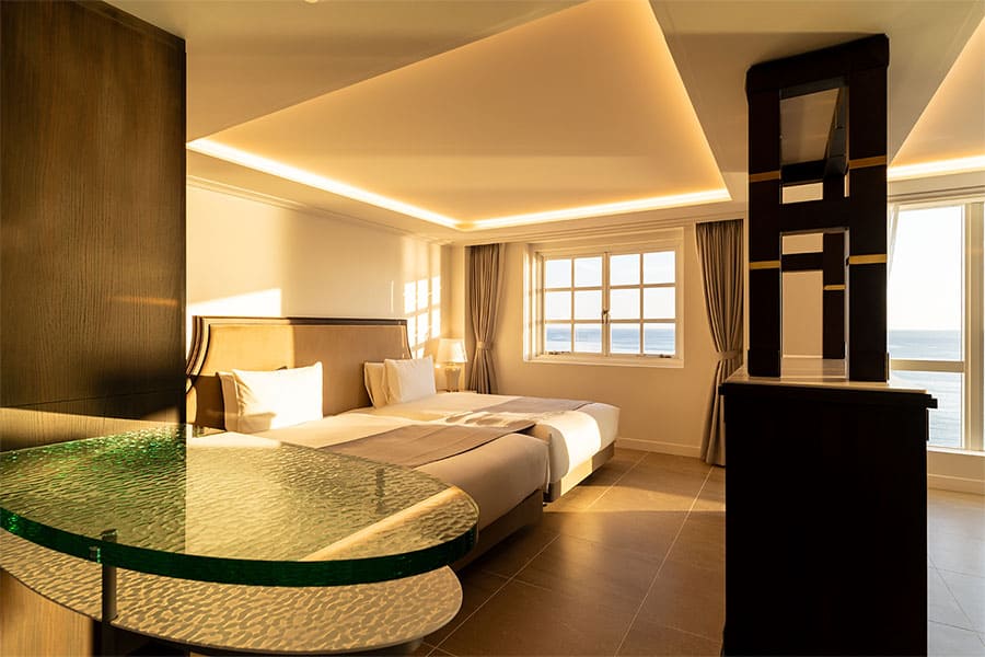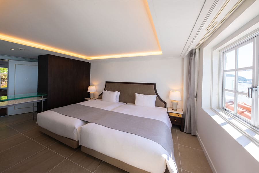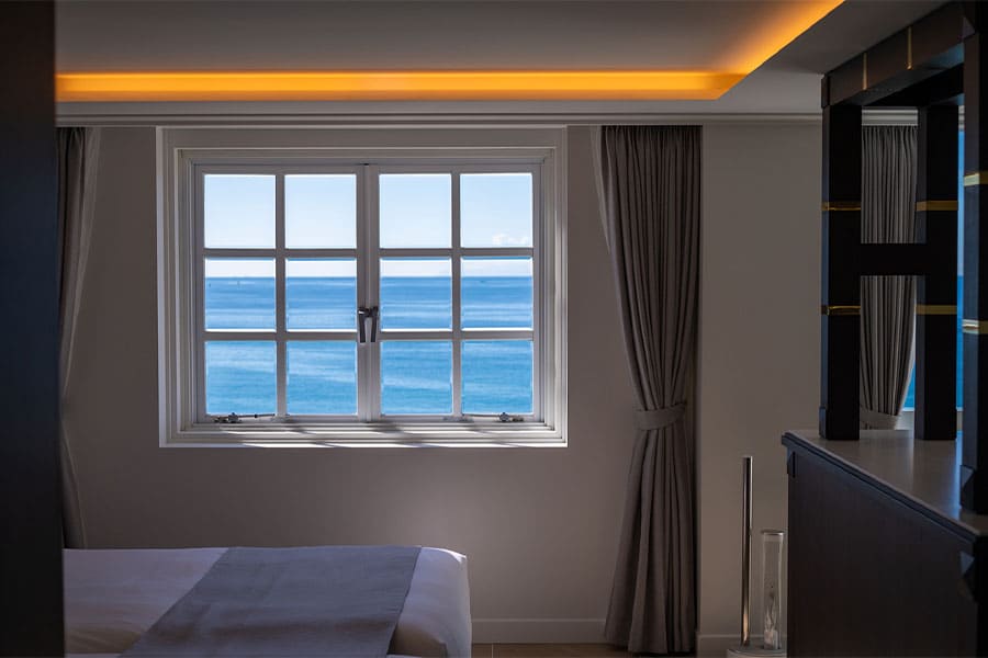横長に広がる居室の窓からは、雄大な大海原を一望でき、もう一方の小窓からは絵画のように切り取られた海の表情をお愉しみいただけます。