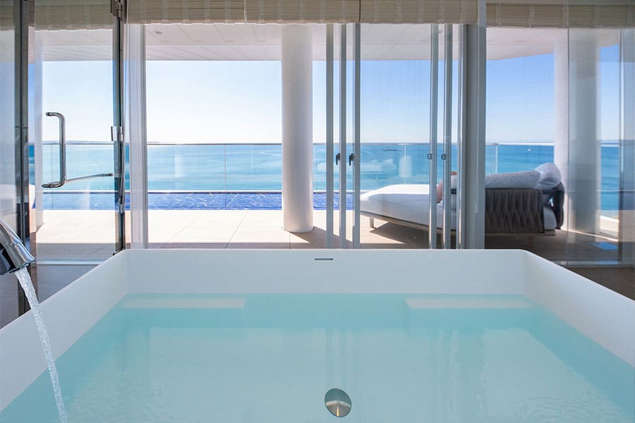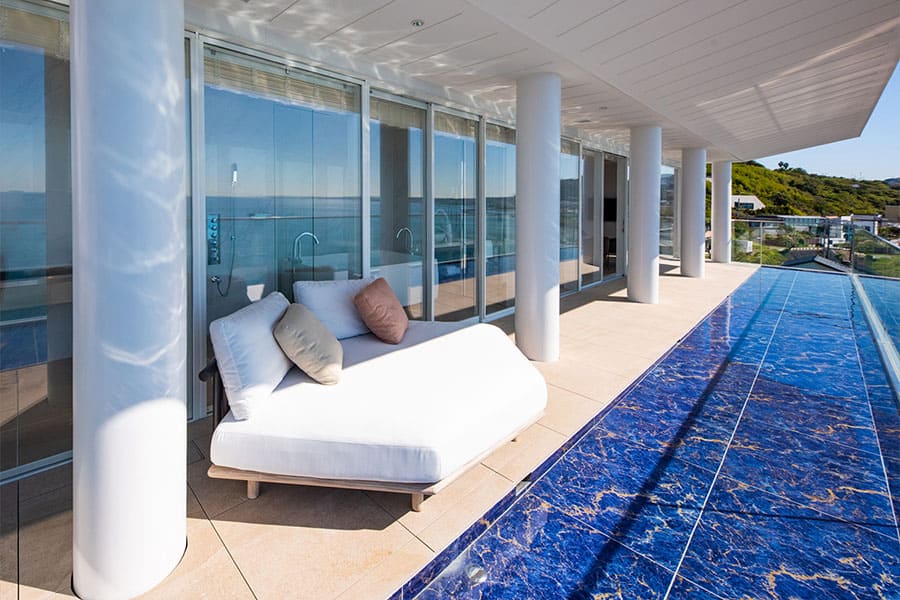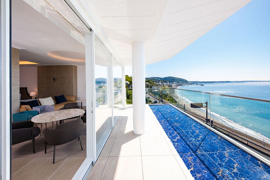 富士山を望む屋根付きバルコニーには水盤テラスやソファを設置。