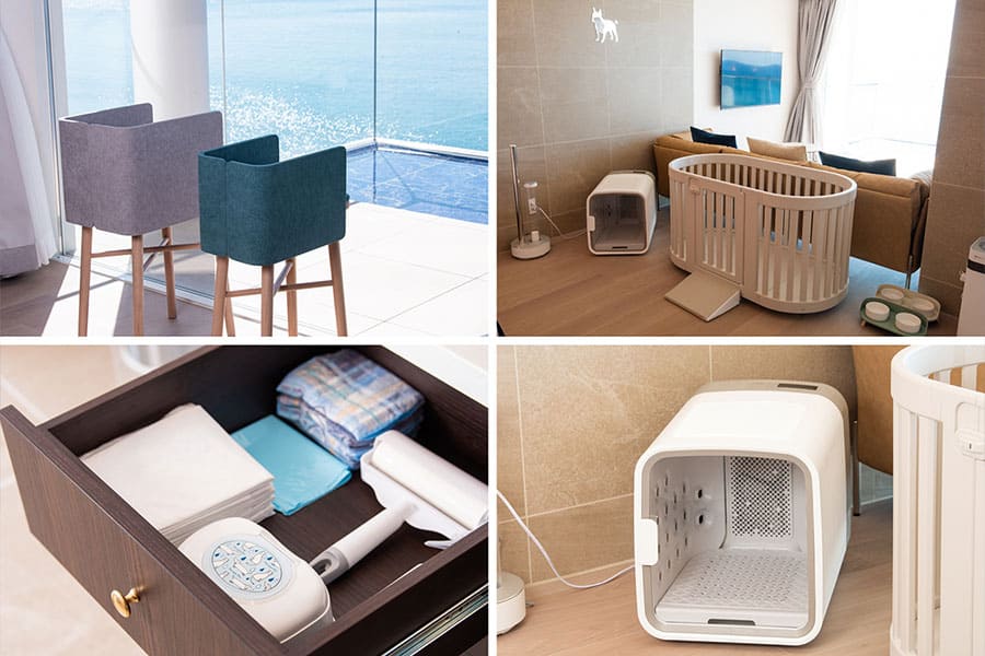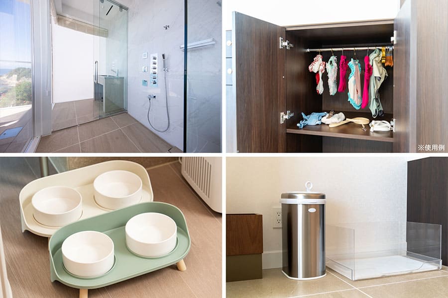 愛犬用の足洗い場・シャワールーム・グルーミング台・バウンサー・ダイニングチェアなど、充実した設備をご用意。滑りにくく広さのある床は、走り回っても安心です。