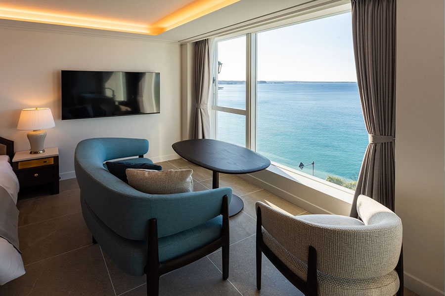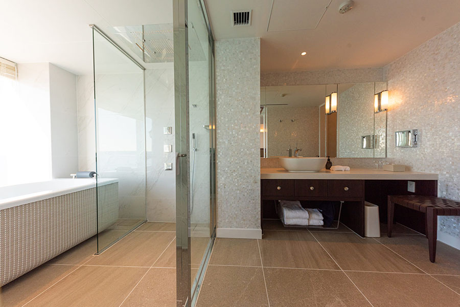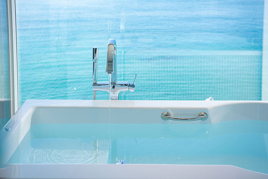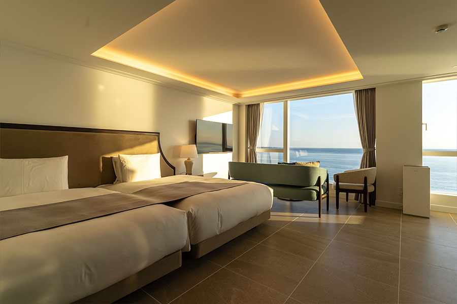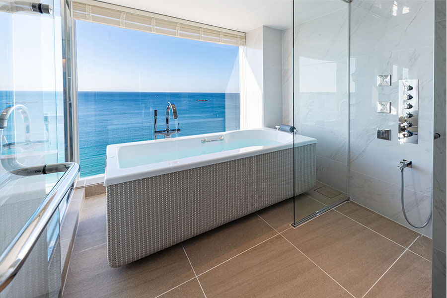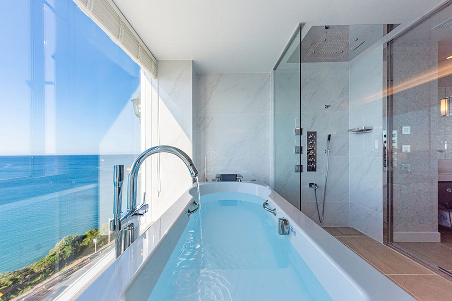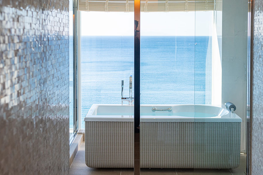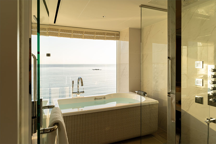 二人掛けソファから広がるのは、窓一面のオーシャンビュー。バルコニーがないことで、より海との距離が近く、常に潮の気配を感じられる特別な空間です。 バスルームでは、浴槽に身を沈めながらまるで海に浮かんでいるかのようなひとときを。コンパクトながら44㎡と十分な広さを備え、心地よい滞在を叶えます。